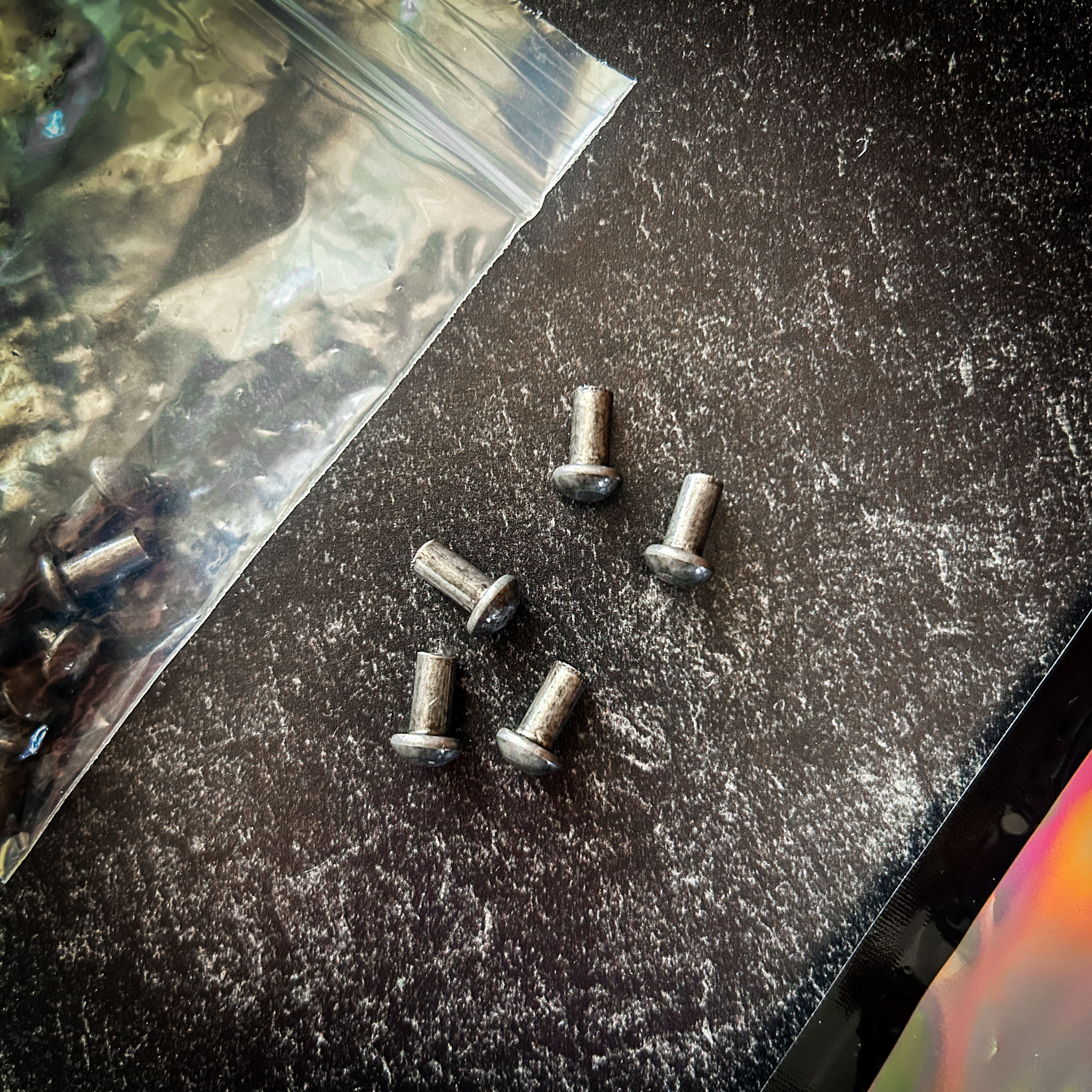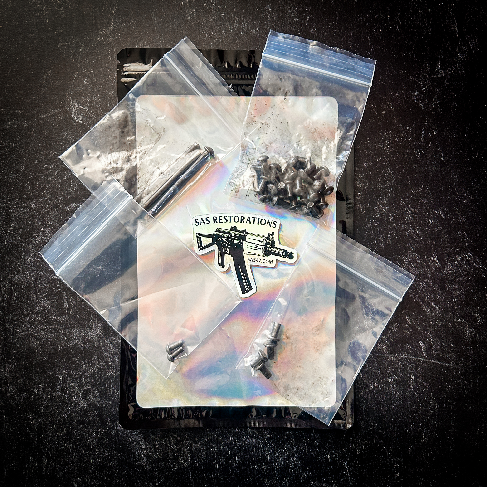 One rivet kit includes 26 round head rivets, 4 flat head rivets, 3 long rivets, and 2 ejector rivets. This rivet kit is specially for PK style rifles. The rivets are 5mm and must be cut to the correct lengths for your builds. The rivets are made of high quality steel and actual metric sizes, unlike other rivet kits available on the market.
